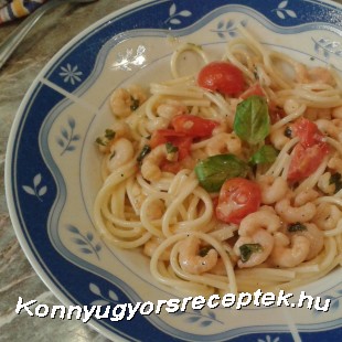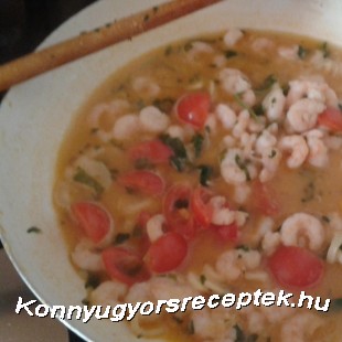 Egy serpenyőben olajat hevítünk és beledobjuk a megtisztított felaprított salotta hagymát egy percig pirítjuk, majd következik a felszeletelt fokhagyma további egy percre, majd a koktélparadicsom további egy perces pirítás, végezetül a rákokat dobjuk a serpenyőbe, további egyperces pirítás.