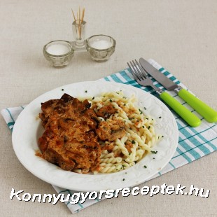 Ezután a puhára párolódott húsra öntsük rá a tejfölös gombát, majd tegyük vissza a sütőbe, és süssük készre.