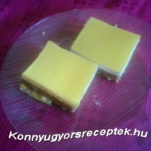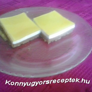 Az első réteghez 3 tojás sárgáját, 1 csomag vaníliás cukrot és 5 evőkanál porcukrot habosra keverünk egy műanyag tálban, majd a 3 tojásfehérjét kemény habbá verjük. 1,5 dl vízben 2 evőkanál zselatint forrásig simára keverünk. Mikor felfőtt, a zselatin melegen hozzákeverjük a tojássárgájához. A formába öntjük, ez lesz a legalsó lap. Fél órára a hűtőbe tesszük.