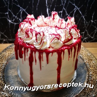 10. A díszítéshez a fehércsokit gőz felett megolvasztjuk, simára keverjük az egyenként hozzáadott olajjal, majd ételfestékkel pirosra színezzük. Teáskanállal a torta szélein végigcsorgatjuk, majd a habzsákból halmokat nyomunk a torta tetejére és kuszán összecsíkozzuk a halmokkal együtt a torta tetejét a maradék pirosra festett fehércsokival.
