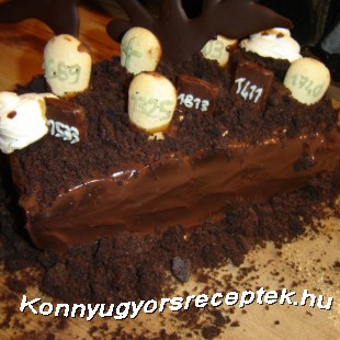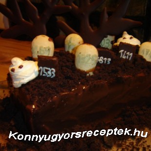 8.Egy hegyes, éles kés segítségével hosszúkás nyílásokat vágunk a tetejébe, amikbe beleillesztjük a piskótákat, ostyalapot, a fákat. A félretett, lereszelt maradék tésztát rászórjuk, és a torta köré is hintünk belőle. Pár szellemet is ültetünk a tetejére.