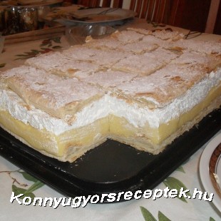 A leveles tésztából tepsi hátán két lapot sütünk. Az egyiket rögtön felkockázzuk. A tojások fehérjét kemény habbá verjük. A pudingot megfőzzük a vízben amibe a cukrot beletettük, ha már sűrű, belekeverjük a tojás habját, óvatosan kevergetve még 1-2 percig összefőzzük. Az egyik lapot visszatesszük a tepsibe, ha kapcsos köré csatoljuk, ha nem , akkor alufóliából keretet hajtunk köré. A még forró krémet rá simítjuk a lapra, kihűtjük. Közben a Hulalát keményre verjük, és a kihűlt krémre simítjuk, rátesszük a felkockázott tésztát, porcukorral meghintjük.