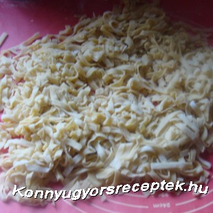 A tésztát lisztezett nyújtódeszkán vékonyra nyújtjuk.majd 4-5 cm széles csíkokra vágjuk,amiket egymásra helyezünk,de közéjük lisztet tegyönk, hogy ne ragadjon össze.2-3 mm-es metéltre vágjuk össze.
