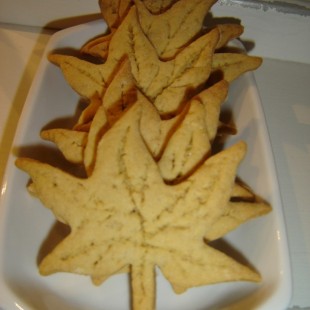 2. Ezután lisztezett deszkán még átgyúrjuk és kb.3 mm. vastagra nyújtjuk.Juharlevélre emlékeztető formával kiszúrjuk.A levelek erezetét éles késsel megrajzoljuk.