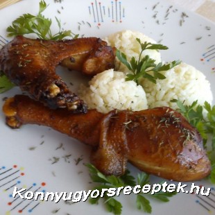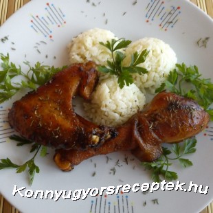 A csirkét megmossuk,és feldaraboljuk, majd az alaplében puhára főzzük. Egy hőálló tál alját megszórjuk ételízesítővel, majd belehelyezzük a csirkehúsokat. Sóval, borssal, delikáttal, kakukkfűvel megszórjuk, kevés olajjal meglocsoljuk, majd a húsleves alaplével meglocsoljuk. Előmelegített sütőben pirosra sütjük, időközönként a húslével meglocsolgatva. Melegen párolt rizzsel tálaljuk. Tálalás előtt egy kevés kakukkfűvel szórjuk meg a húsokat.