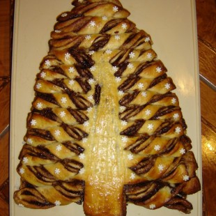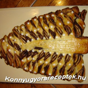 4. Éles késsel megformázzuk a fenyőfa törzsét és mindkét oldalt 1-1.5 cm-es csíkokat vágunk a tésztába amit kétszer megcsavarunk.Majd 1/2 óráig még kelesztjük meleg helyen.