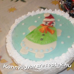 A krémhez a csokoládékat összetörjük, és annyi tejszínt adunk hozzá, hogy épp ellepje. Lassú tűzön egyneművé keverjük. Kihűtjük. A maradék habot keményre verjük, és óvatosan fokozatosan keverjük hozzá a csokis masszát. A tortát 3 lapba vágjuk, és betöltjük, úgy hogy a tetejére, és oldalára is kerüljön. Tetejére nyújtható cukormasszából hóembert készítettem, és tejszínhabbal díszítettem.