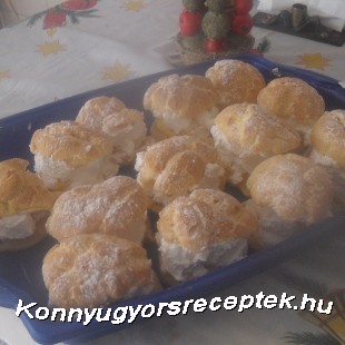 A tésztához a vizet feltesszük forrni a sóval és a zsiradékkal, ha felforrt hozzáadjuk a lisztet. Kis lángon addig főzzük, amíg elválik az edény falától. Kicsit kihűtjük. Kézi mixerrel egyenként hozzádolgozzuk a tojásokat. Sima fényes tésztát kapunk. Sütőpapírral bélelt tepsire -távol egymástól- kis halmokat teszünk ( habzsák, vagy vizes kézzel gombócok), és 200 C fokra előmelegített sütőbe toljuk. Kb. 15-20 perc sütés a hőfokot levesszük 150 C fokra, és további 10-15 percig sütjük. ( kitámaszthatjuk a sütés ideje alatt villával a sütő ajtaját, hogy a gőz távozzon). Ha elkészült, kinyitjuk a sütő ajtaját, és ott hagyjuk langyosra hűlni a tésztát.