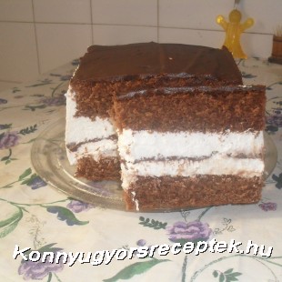 A kihűlt lapot keresztben kettévágjuk. Keretet készítünk köré. Az egyik lapot beletesszük, és rásimítjuk a krém felét. 20 percre a mélyhűtőbe tesszük. Kivesszük, rásimítjuk a csokiöntetet. Ismét 20 perc mélyhűtő. Rá a krém másik fele, mélyhűtő. Tetejére rakjuk a másik lapot, majd rá simítjuk a csokoládé mázt. Hidegre tesszük, majd szeletekre vágva tálaljuk