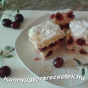 A maradék tésztát rásimítjuk a rétestészta tejére, végezetül rászórjuk a megmaradt magozott meggy másik felével. A tetejét befedjük 2 db olajjal megkent rétes lappal.