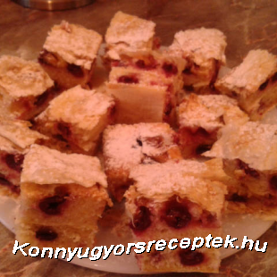 Veszünk egy 23X39 cm tepsit kikenjük olajjal,majd 3db rétes lapot teszünk az aljára úgy ,hogy mindegyiket megkenjük kevés olajjal,majd a tészta felet belesimítjuk a tepsibe .A magozott meggy felével megszórjuk. Ismét 3 db réteslap következik amivel betakarjuk a meggyet.A maradék tésztát rásimítjuk a rétestészta tejére,végezetül rászórjuk a megmaradt magozott meggy másik felével.A tetejét befedjük 2 db olajjal megkent rétes lappal.
