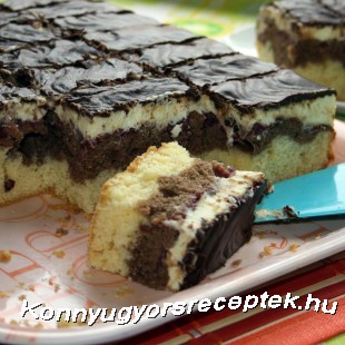 A tepsit kibéleljük sütőpapírral, és a tészta jó kétharmadát a tepsire simítjuk. A kakaóport és a tejet a maradék tésztához keverjük. A sötét tésztát egyenletesen rásimítjuk a világos tésztára. Elosztjuk rajta a lecsepegtetett meggyet, és finoman belenyomjuk a tésztába. A süteményt a sütőben középen, 160 °C-on 35-40 percig sütjük, majd hűlni hagyjuk.