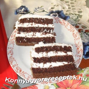 A piskótához a tojást a cukorral habosra kavarjuk, majd hozzáadjuk az olajat, majd az előzőleg összekevert száraz anyaggal szép simára keverjük.Sütőpapírral bélelt nagyméretű tepsibe simítjuk, és 180 C fokos sütőben kb. 10-12 perc alatt megsütjük. Ha kihűlt 3 hosszú csíkba vágjuk, betöltjük a krémet, a tetejére is krémet kenünk, megszórjuk kókusz reszelékkel. Pár órára hűtőbe tesszük.