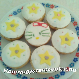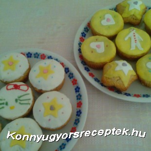 Amikor megsült a muffin, amíg hűl, addig egy nylont lerakok az asztalra, ezt kicsit megszórom porcukorral, erre rárakom a marcipánmasszát, majd ennek a tetejét is megszórom, erre pedig rárakok egy másik nylont, s nyújtófa segítségével kinyújtom 1-2 mm-es vastagságúra. Én pohár segítségével 6 db sárgát, 6 db fehéret kiszaggattam.