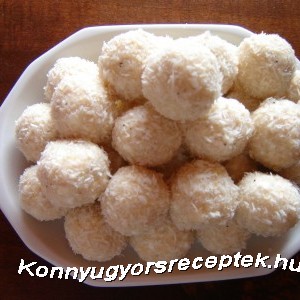 3.Kis golyókat készítünk,közepükbe mandulát,vagy mazsolát teszünk,majd a kókuszreszelékbe meghempergetjük.