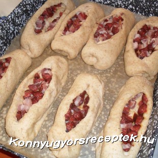 Lisztezett felületre borítjuk, 8 egyforma darabba vágjuk. Egyenként hosszú csík formára nyújtjuk.