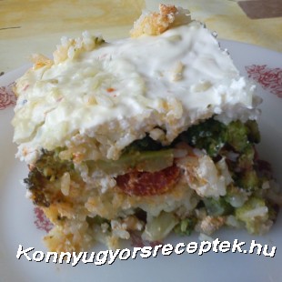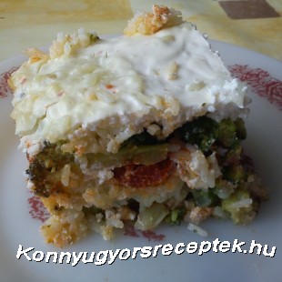 A brokkolit rózsáira szedjük, megmossuk, sós vízben megpároljuk, majd lecsepegtetjük. A rizst kevés olajon lepirítjuk, majd dupla mennyiségű vízzel felengedjük. Sóval, őrölt borssal, delikáttal ízesítjük, beletesszük a fél zöldpaprikát, majd fedő alatt puhára pároljuk. Egy tűzálló tepsit kivajazunk, majd a brokkoli felét a tepsi aljába halmozzuk. Ráhelyezünk egy sor rizst, amit a zúzott fokhagymával elkevert tejföllel fedünk be, és a karikára vágott füstölt kolbásszal beterítünk. Tetejére halmozzuk a brokkoli másik felét, amit bőségesen befedünk tejföllel. Előmelegített sütőbe helyezzük, és készre sütjük.