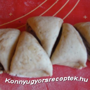 Kinyújtjuk lisztezett deszkán kb. 1/2 cm vastagra, olvasztott vajjal megkenjük.