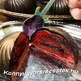 7. A krémek közepére egy-egy teáskanál zselét helyezünk, majd a vörösbársony piskótából akkora köröket szaggatunk ki, amik kisebbek a formák aljánál. Belenyomjuk a krémbe úgy, hogy a krém a szélein feljöjjön, de a forma széleinél ne legyen magasabban se a krém, sem a piskóta.