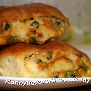 2. Langyos helyen a duplájára kelesztjük, majd lisztezett felületen átgyúrjuk a tésztát. Fél cm vékony téglalappá nyújtjuk, és megkenjük krémsajttal. A kukoricát és a főtt borsót egy tálban összekeverjük, majd hozzáadjuk az apróra vágott metélőhagymát.