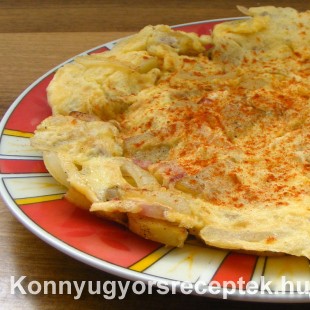 A burgonyát meghámozzuk és kis kockákra darabolva egy kis olajjal serpenyőbe tessszük sütni. Közben feldaraboljuk a hagymát (nem apróra!) és a szalonnát kisebb darabokra vágjuk. Ha a burgonya megpuhult hozzátesszük a feldarabolt hagymát, majd 1-2 perc múlva a szalonnát. Megszórjuk egy kis fekete vagy fehér borssal és közben felverjük a tojásokat amit kissé meg is sózunk. Ha a serpenyőben átsült az étel akkkor hozzáönthetjüka tojásokat is. Egyszer átkeverjük és takarék lángon lassat sütjük amig félig átsül. Etután átfordítjuk a másik oldalára, de ezt az oldalt csak 1 percik sütjük. Ha elkészült egy lapos tányérra csusztatjuk a serpenyönkből. A tetejét megszórhatjuk egy kis piros paprikával.