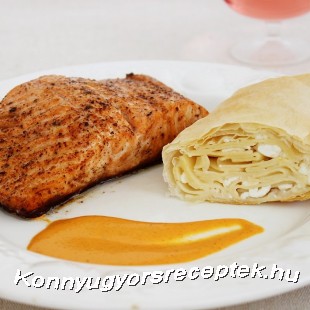 Tálaláskor helyezzük tányérra a lazacszeletet, ízlés szerint locsoljuk meg a paprikamártással, tegyünk mellé pár szeletet a túrós csusza rétesből, és úgy kínáljuk.