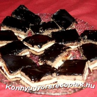 3 cipót gyúrunk belőle, 2 kakaós, 1 sárga tészta. Kisodorjuk először a kakaóst, zsírozott lisztezett tepsibe tesszük, megkenjük lekvárral, erre kerül a sárga lap, majd ezt is megkenjük lekvárral, és tetejére a barna tésztát tesszük.