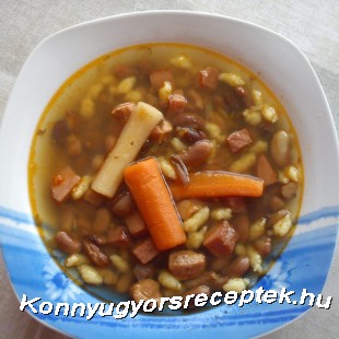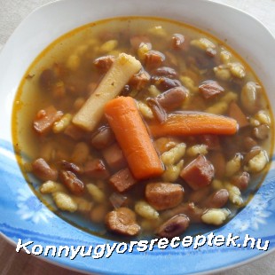 A babot előző este beáztatjuk. A vöröshagymát apróra vágjuk, majd a füstölt szalonna zsírján lepirítjuk, Rádobjuk a zúzott fokhagymát, majd a tűzről levéve megszórjuk őrölt csemege paprikával. Hozzáadjuk a kockákra vágott sertéshúst, füstöltsonkát és jól átforgatjuk. Sózzuk, borsozzuk, megszórjuk delikáttal, majd felengedjük vízzel. Beletesszük a karikára vágott füstölt kolbászt, az erős paprikát, a zöldpaprikát, a sárgarépát, a petrezselymet, a babot és addig főzzük amíg a hús és a bab megpuhul. Ekkor a tojásból, sóból és réteslisztből elkészítjük a csipetkét amit a levesbe teszünk és néhány perc alatt a levesben puhára főzzünk. Forró tejföllel tálaljuk.