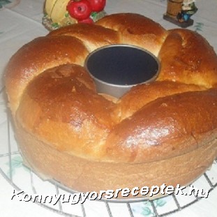 Ha a tészta megkelt, kétfelé vesszük, hosszú keskeny tésztát nyújtunk belőle, megkenjük a töltelékkel, felcsavarjuk,mint a bejglit, majd a két szálat összetekerjük. Egy 26 cm-es kuglóf formát vajjal kikenünk, és belefektetjük a tésztát. Ismét kelesztjük. Ha megkelt tojással lekenjük, majd 180 C fokra előmelegített sütőbe téve, szép pirosra sütjük. ( kb. 45-50 perc, a felénél le lehet takarni alufóliával, hogy ne égjen meg a teteje.) Még melegen megkenjük forró baracklekvárral, és rácson hagyjuk kihűlni.