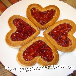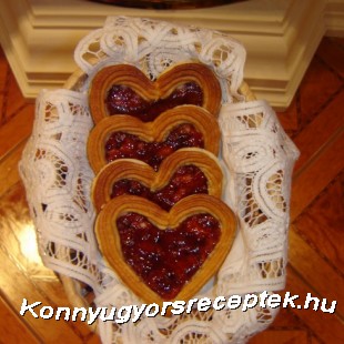 3. A tésztát lisztezett deszkán 3-4 mm vékonyra kinyújtjuk és kiszúrjuk egy kb.10 cm-es szív kiszúróval.Sütőpapírral fedett sütőlapra tesszük.