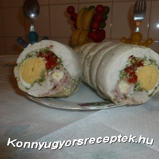 petrezselymes szósszal, kirakjuk a végét a főtt tojással, amit félbe vágtunk, hagyunk kis helyet, rakunk egy sor vékony csíkokra vágott kaliforniai paprikát, megint kihagyunk egy kis helyet, mehet egy sor sonkába tekert sajt. Ezután jó szorosan feltekerjük a folpackkal. A végeit megcsavarjuk, majd még egy réteg folpack-ba tekerjük jó szorosan, sőt zsineggel át is kötözzük. Ezek után egy hideg vízzel telt lábasba tesszük. Feltesszük főzni, és a forrástól számított 1 órán keresztül lassú tűzön főzzük. A vízben hagyjuk kihűlni. Kivesszük, majd legalább 8 órán keresztül a hűtőbe tesszük, majd csak utána vágjuk le róla a folpackot.