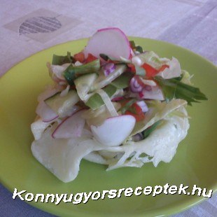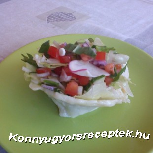 A paradicsomot, az uborkát, és a retket összedaraboljuk, a lilahagymát felszeleteljük és a salátakeverékhez adjuk. Egy teflon serpenyőt vékonyan kikenünk olajjal, és a reszelt sajt negyedét beletesszük. Picit sózzuk, borsozzuk megszórjuk kakukkfűvel és addig sütjük amíg megszilárdul. Előveszünk egy üvegpoharat és a sajtot óvatosan rácsúsztatjuk, majd lenyomkodjuk, hogy felvegye a pohár (kosár) alakját. A sajtból négy kosárkát készítünk, és amikor elkészültek akkor megtöltjük őket a salátával. Meglocsoljuk az olívaolaj, só, bors, mustár és a zúzott fokhagyma keverékéből készített öntettel, és azonnal tálalhatjuk.