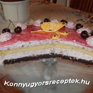 A barna piskótát visszatesszük a formába, megkenjük a krém felével, rátesszük a fehér piskótát, a maradék krémmel megkenjük, az oldalát is. Tetszés szerint díszítjük. Hűtőbe téve, másnap szeleteljük.