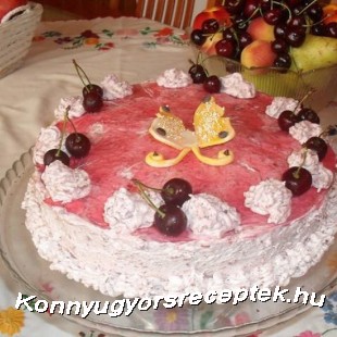 A krémhez a joghurtot egy tálba öntjük a porcukorral együtt, kicsit össze turmixoljuk. A zselatint kb. 1 dcl hideg meggylébe áztatjuk. A hulalát kemény habbá verjük. A megduzzadt zselatint felmelegítjük, a gyümölcshöz adjuk, majd óvatosan hozzákeverjük a kemény tejszínhabot.
