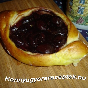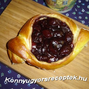 4. Közepükre kupacot rakunk a meggyes töltelékből, majd a tészta egyik szélét áthajtjuk a töltelék felett, és ugyanígy járunk el a másik szélével is.Tesibe téve meleg helyen még 20 percig kelesztjük. Sütés előtt a tésztát tojással megkenjük.
