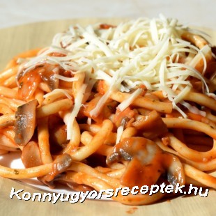 15 percig főzzük, ha látjuk hogy kezd pirulni akkor adjunk hozzá egy kis vizet, hamar lefő róla. Közben megfőzzük a makaróni tésztát is külön. Ha kész a gomba akkor hozzáadjuk a sürített paradicsomlevet, fűszerezzük és még főzzük legalább 10 percig.