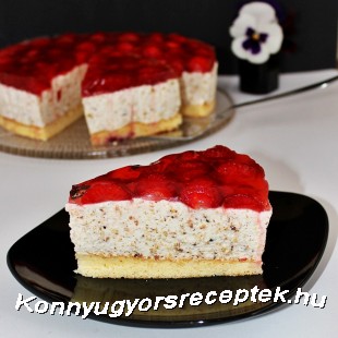 Ezután a felezett eperszemekkel rakjuk ki a torta tetejét.