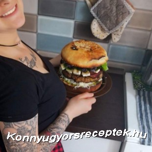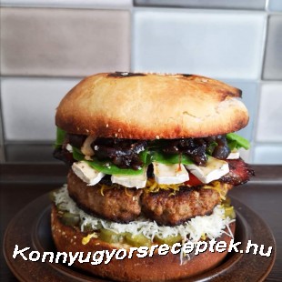a buci aljára kerül a ketchup, mustár ízlés szerint, erre a felkarikázott csemege uborkák, rá a reszelt edami sajt, a sajt tetejére a húspogácsa, erre kerül a reszelt cheddar sajt, a sajtra az átsütött füstölt sonka, majd erre a felkarikázott paradicsom, rá a felszelelt camambert sajt, rá a saláta levelek, végül a karamellizált lilahagyma.