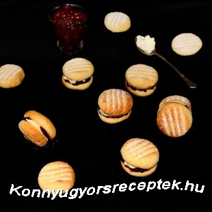 Tegyünk a keksz közepére egy mokkáskanál dzsemet, majd a dzsemre egy mokkáskanál vajkrémet. Ezután helyezzünk rá egy másik kekszet, és óvatosan kicsit nyomjuk össze. (így járjunk el az össze keksszel)