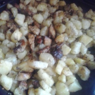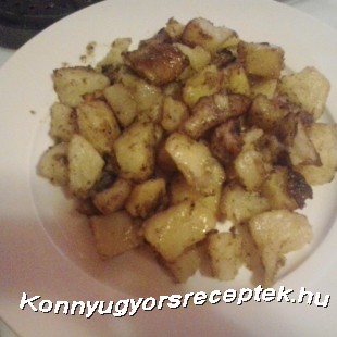 A húst kis csíkokra szeleteljük és az áttört fokhagymával, borssal, sóval és fél dl olajjal összekeverjük. És lábasba puhára pároljuk. A meghámozott burgonyát közepes kockákra vágjuk és sós vízben félig megfőzzük. Majd a burgonyát tepsibe rakjuk és rá a húst és a maradék olajjal meglocsoljuk és ropogósra összesütjük 200 c sütőben.