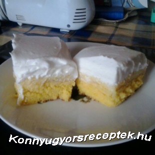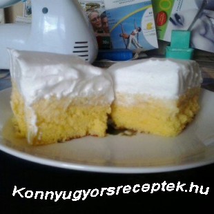 3. A habtejszínt a habfixálóval kemény habbá verjük, és a sütemény tetejére halmozzuk. Szeletelve tálaljuk.