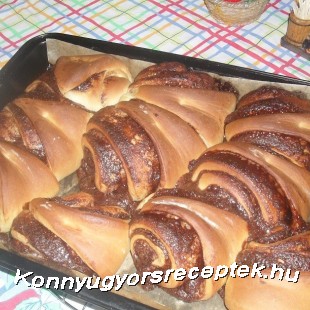 Ha megkelt, vékony téglalappá nyújtjuk, és megkenjük a töltelékkel. Szorosan feltekerjük a hosszanti oldalánál, és tompa végű háromszögekre vágjuk.
