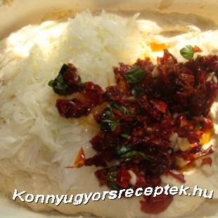 4 Ha megkelt,a hagymát reszeljük le, vagy vágjuk apróra, a paradicsomot és a fűszereket vegyük ki az olajból csepegtessük le, majd keverjük a tésztához a belisztezett munkalapon.