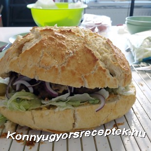 A zsemlét félbevágjuk, megtöltjük a húspogácsával, salátával, sajttal, hagymával és tetszés szerinti ízesítőkkel.