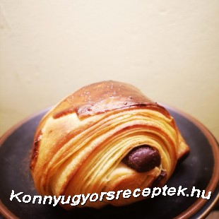 8. Pihentetés után lisztezett deszkán kb 30x30 cm-es kockára nyújtjuk, átporoljuk lisztes ecsettel, széleit egy éles késsel picit levágjuk hogy látszódjanak a tészta rétegei és egymás alá függőlegesen elhelyezünk 4 db csokirudat. Alattuk hosszában elvágjuk a tésztát, így mind a 4 csokirúd megkapja a saját tészta szalagját.