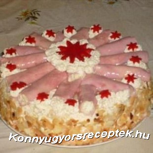 A tetejére tormakrémmel töltött gépsonkát tettem, zselatinnal áthúztam, a maradék fehér krémből rózsákat nyomtam rá, és kaliforniai paprikából kivágott kis virágokkal díszítettem.