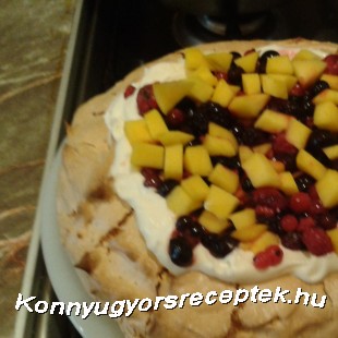 A krémet csak tálalás előtt kenjük a *tésztára*, ráhalmozzuk a felkockázott mangót és a vegyes gyümölcsöt.