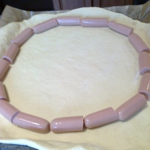 2. Kinyújtottam kerek alakúra, körberaktam virslivel úgy, hogy a szélén maradjon 3 cm üresen > ezt az üres részt ráhajtottam a virslire. A virslis részt bevágtam 1,5 cm-ként, majd minden egyes ilyen tésztás-virslis részt elfordítottam.