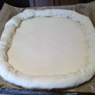 1. A pizza tésztát a kenyérsütő gépben dagasztottam be, majd kikapcsolt gépben 25-30 percig kelesztettem.