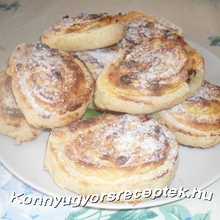 Az élesztőt kevés cukros tejben felfuttatjuk, majd a többi hozzávalóval ruganyos tésztát dagasztunk. Meleg helyen duplájára kelesztjük. Míg kel, elkészítjük a tölteléket. A túrót villával összetörjük, a vízben a cukorral sűrűre főzzük a pudingot. Kihűtjük. Botmixerrel simára keverjük a többi hozzávalóval. A megkelt tésztát téglalap alakúra nyújtjuk, megkenjük a töltelékkel, feltekerjük, és jó ujjnyi vastagságúra felszeleteljük. Papírral bélelt tepsire téve, még egy kicsit kelesztjük. 180 C fokos sütőben szép pirosra sütjük. ( alsó-felső sütés, kb. 50 perc). Még melegen megszórjuk porcukorral.